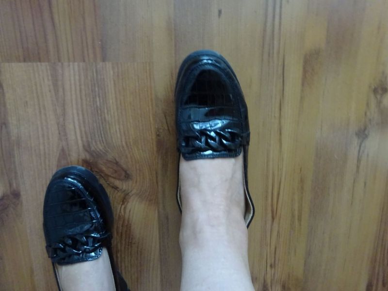 Die Schuhe sind schön, bequem. Allerdings gefällt mir nicht, dass der Schuh beim Gehen nicht schön am Fuß klebt, sondern vom Fuß bis zur Hüfte kratzt. Unter breiteren Hosen lässt sich das kaschieren, aber mit einem Schal kann ich sie nicht tragen.